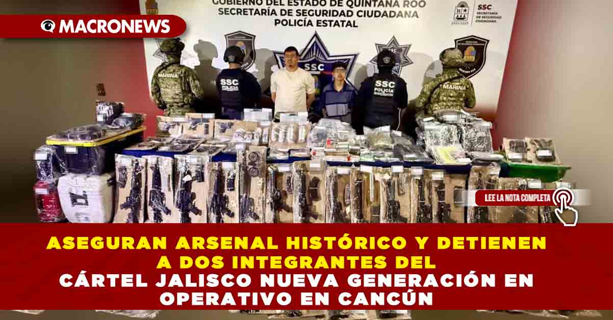 Cancún, 16 de noviembre.- En un operativo coordinado de la Secretaría de Seguridad Ciudadana (SSC) de Quintana Roo, con la Secretaría de Marina (Semar), se logró el aseguramiento de armamento considerado histórico en la Zona Norte del estado y la detención de dos presuntos integrantes del Cártel Jalisco Nueva Generación (CJNG).