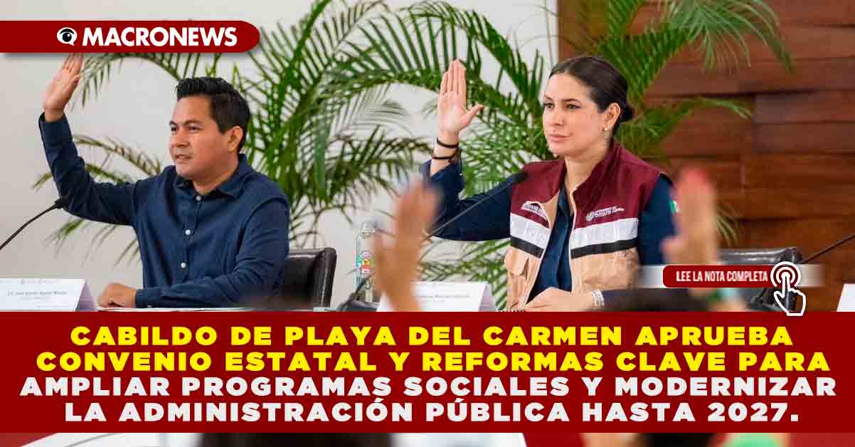 Redacción Macronews.- En la Vigésima Séptima Sesión Ordinaria del Cabildo de Playa del Carmen, encabezada por la alcaldesa Estefanía Mercado, se aprobaron acuerdos estratégicos que consolidan el compromiso del gobierno municipal con la justicia social, la modernización administrativa y el bienestar de las y los playenses. Entre los puntos destacados, se autorizó por unanimidad la firma de un convenio con el Poder Ejecutivo del Estado de Quintana Roo para ampliar la cobertura de programas sociales, con vigencia hasta el 29 de septiembre de 2027.