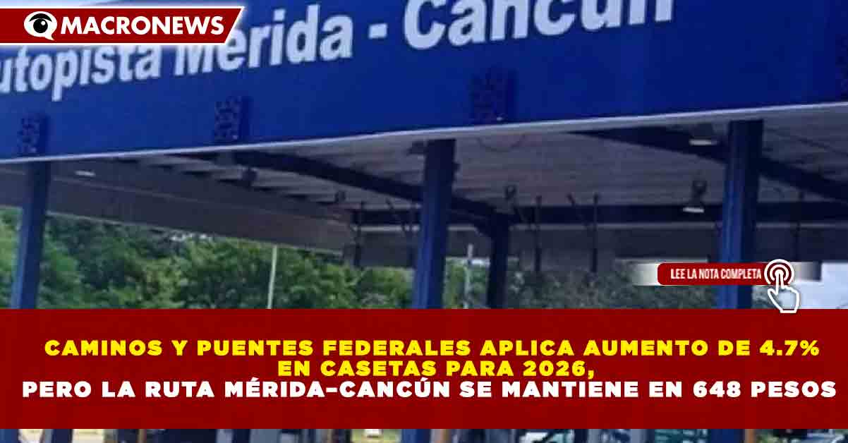 Redacción Macronews.- Caminos y Puentes Federales (Capufe) aplicó un incremento promedio de 4.7% en las tarifas de casetas en diversas autopistas del país durante 2026; sin embargo, la autopista Mérida–Cancún se mantiene sin cambios, conservando un costo de 648 pesos para automóviles.
