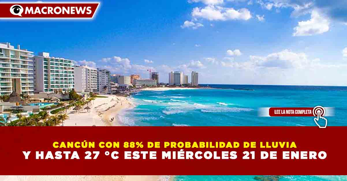 Redacción Macronews.- El clima en Cancún para este miércoles 21 de enero estará marcado por lluvia ligera, con una temperatura matutina de 22 grados y una máxima que alcanzará los 27 grados, de acuerdo con el pronóstico meteorológico más reciente.