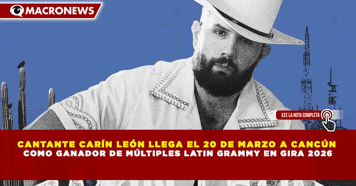 Redacción Macronews.- El cantante sonorense Carín León se presentará el próximo viernes 20 de marzo en Cancún, como parte de su gira 2026, consolidada tras obtener múltiples premios internacionales, incluidos Latin Grammy, y posicionarse como una de las figuras más influyentes del regional mexicano.
