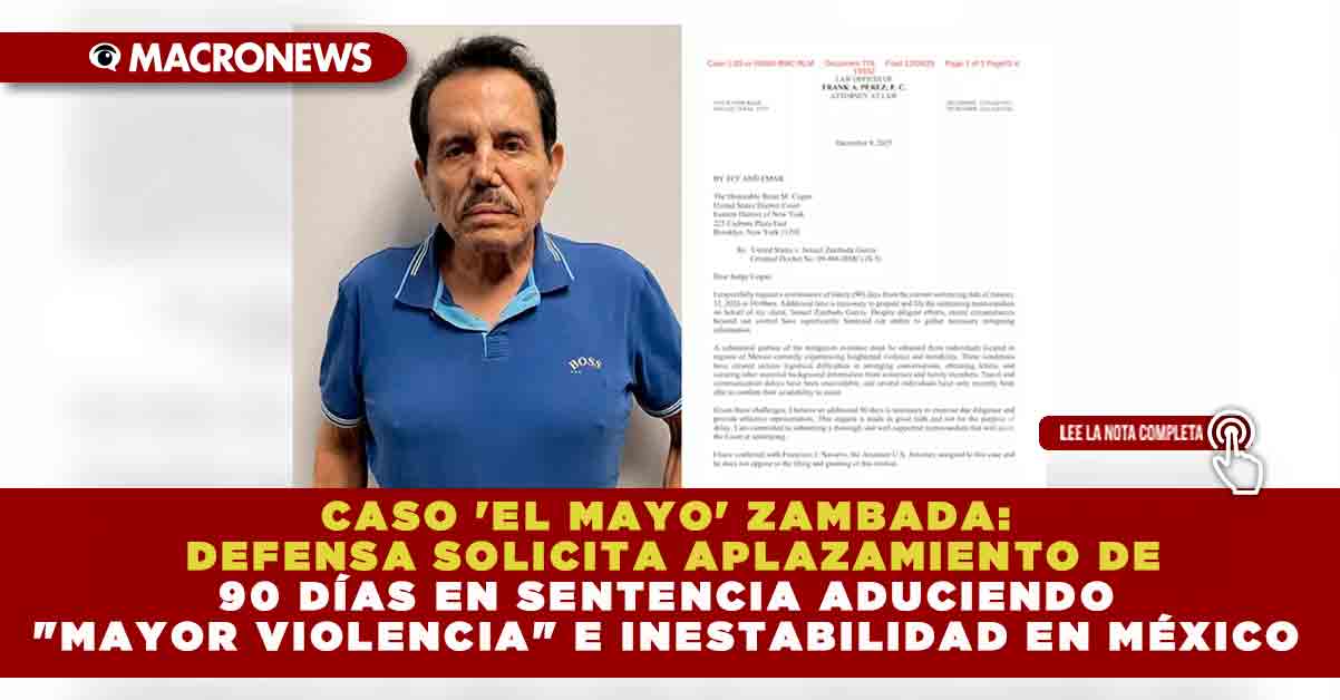 Redacción Macronews.- El proceso judicial contra Ismael “El Mayo” Zambada García, cofundador del Cártel de Sinaloa, enfrenta una nueva solicitud de prórroga. El abogado defensor, Frank A. Pérez, pidió formalmente al Tribunal del Distrito Este de Nueva York posponer por 90 días la fecha límite para la entrega del memorando de sentencia, originalmente fijada para el próximo 12 de enero de 2026. La justificación principal esgrimida por la defensa es la «mayor violencia e inestabilidad» que prevalece en distintas regiones de México, circunstancia que, según argumenta, ha entorpecido la capacidad de recabar información crucial y mitigatoria para el caso.