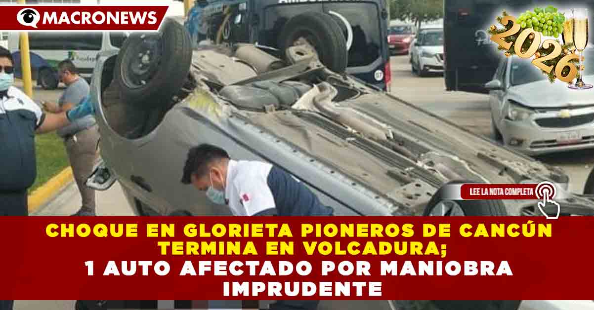 Redacción Macronews.- Un aparatoso accidente vial se registró en la glorieta Pioneros de Cancún, donde un automóvil volcó tras un choque, presuntamente provocado por una maniobra imprudente, lo que generó la movilización de cuerpos de emergencia y autoridades de tránsito.