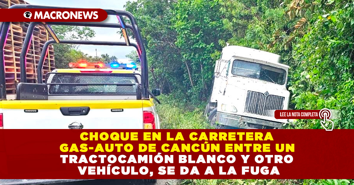 Cancún, Quintana Roo – La mañana de este viernes 25 de octubre, alrededor de las 07:50 horas, se registró un choque en la Carretera Gas-Auto que involucró a un tractocamión blanco marca Internacional y otro vehículo, cuya marca y tipo se desconocen ya que se retiró del lugar tras el accidente.