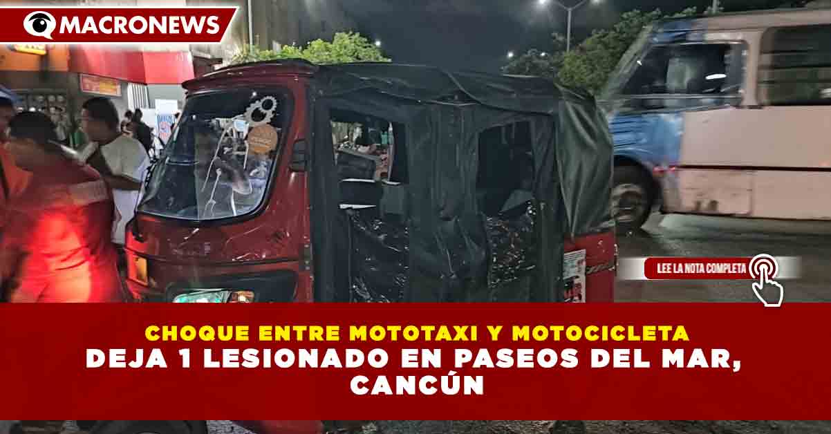 edacción Macronews.- Un pasajero resultó lesionado tras un choque entre un mototaxi y una motocicleta en el fraccionamiento Paseos del Mar, en Cancún, hecho que generó movilización de cuerpos de emergencia y alertó a vecinos de la zona, donde este tipo de incidentes se han vuelto cada vez más frecuentes.