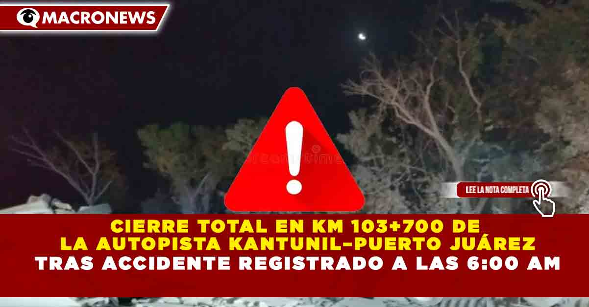 Redacción Macronews.- La Guardia Nacional Carreteras informó la mañana de este jueves 12 de febrero sobre el cierre total de la circulación en la autopista Kantunil–Puerto Juárez, a la altura del kilómetro 103+700, debido a un accidente ocurrido alrededor de las 6:00 horas en las inmediaciones de San Antonio Chuc, en dirección a Cancún.
