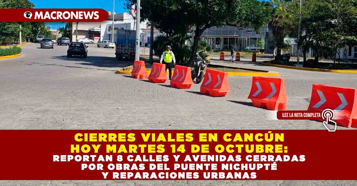 Redacción Macronews.- Este martes 14 de octubre de 2025, la ciudad de Cancún presenta al menos ocho cierres viales parciales en distintos puntos, derivados de obras de infraestructura, mantenimiento urbano y encharcamientos por lluvias recientes. Las autoridades locales exhortan a la ciudadanía a tomar precauciones, ya que los trabajos podrían generar tráfico lento y contratiempos en zonas de alta afluencia vehicular.