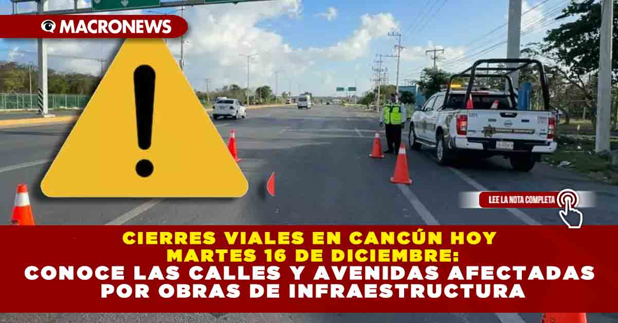 Redacción Macronews.- Continúan las reparaciones y obras viales en distintos puntos de la ciudad de Cancún, las cuales están generando tránsito lento, principalmente durante las horas pico de este martes 16 de diciembre de 2025, por lo que autoridades y medios locales recomiendan a la ciudadanía extremar precauciones y planificar sus traslados con anticipación.