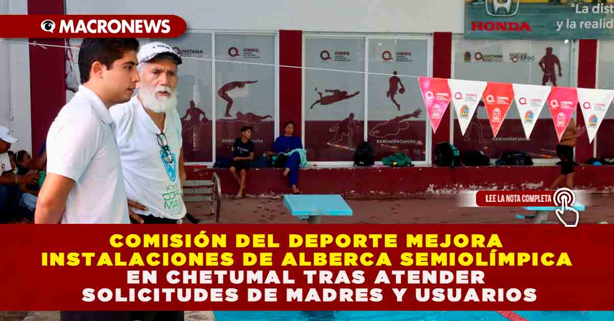 Redacción Macronews.- En cumplimiento del Nuevo Acuerdo por el Bienestar y Desarrollo impulsado por la gobernadora Mara Lezama Espinosa, la Comisión del Deporte de Quintana Roo realizó acciones inmediatas de mantenimiento en la Alberca Semiolímpica del Gimnasio “Nohoch Suku’n” de Chetumal, luego de atender las solicitudes de madres de familia, deportistas y usuarios durante un recorrido de supervisión encabezado por su presidente, Jacobo Arzate Hop.