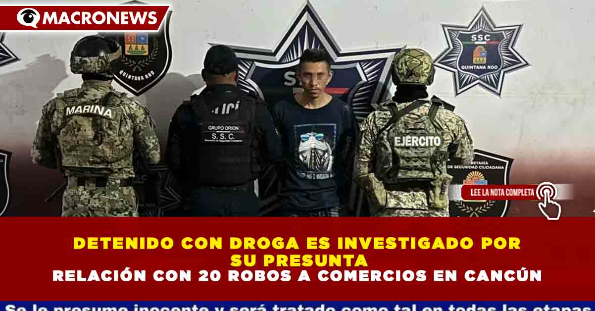 Redacción Macronews.- Un hombre detenido en posesión de droga en Cancún es investigado por su presunta relación con al menos 20 robos a comercios en distintos puntos de la ciudad, informaron autoridades de seguridad.