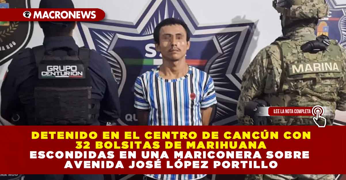 Cancún, 25 de septiembre (InZoom.mx).— Un hombre fue detenido en pleno centro de Cancún tras ser sorprendido con 32 bolsitas de marihuana que llevaba escondidas en una mariconera.
