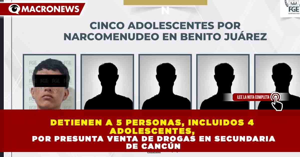 Redacción Macronews.- La Policía de Quintana Roo detuvo a cuatro adolescentes y un adulto por su presunta participación en la venta de drogas dentro de una secundaria ubicada en Cancún, informó la Secretaría de Seguridad Pública. Las autoridades aseguraron que los detenidos podrían enfrentar cargos relacionados con narcomenudeo y delitos contra la salud.