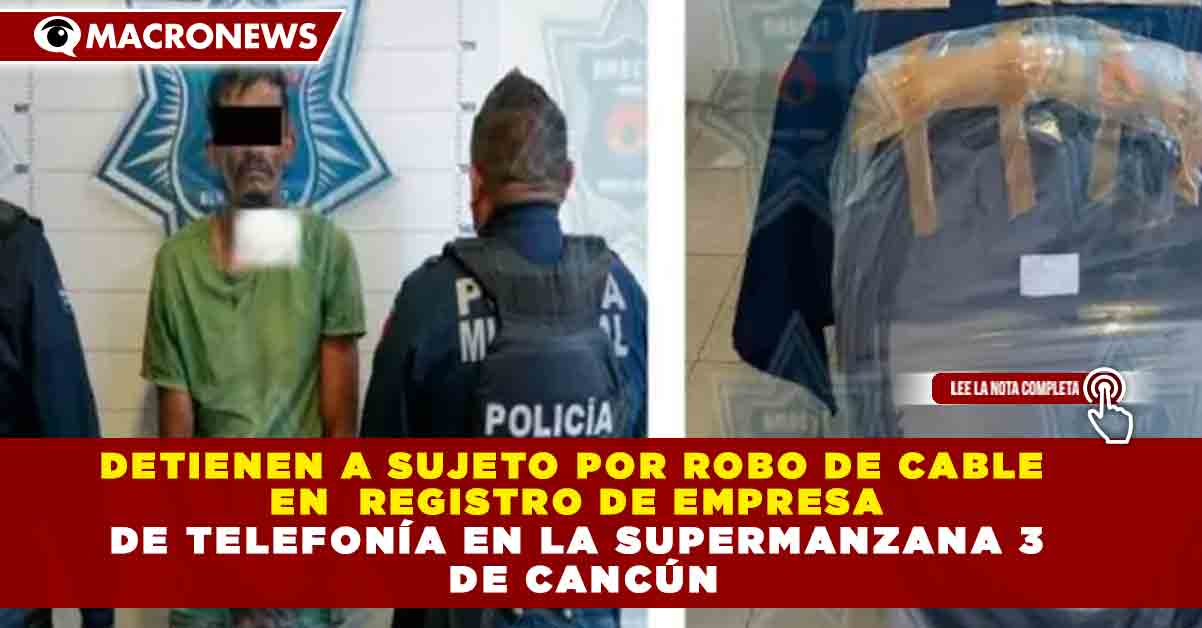 Redacción Macronews.- Elementos de la Policía Municipal de Cancún detuvieron la mañana de este martes a Josué Leonardo “N”, de 33 años de edad, por su presunta participación en el delito de robo de cable perteneciente a una empresa de telefonía, durante recorridos de vigilancia realizados en la Supermanzana 3, como parte de las acciones de prevención del delito.