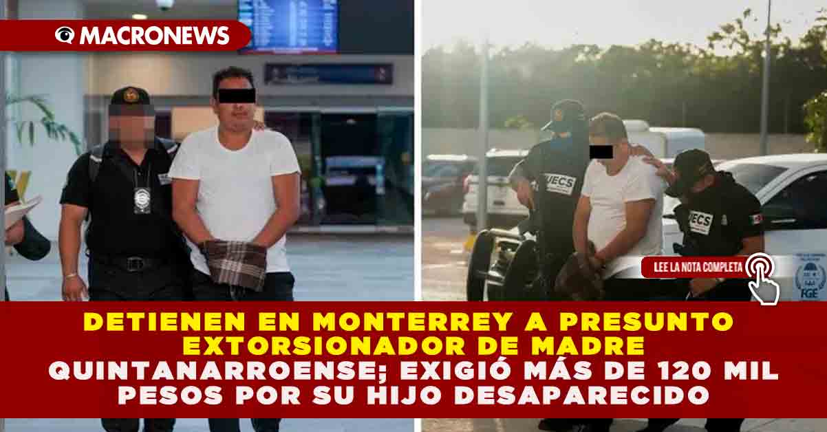 Redacción Macronews.- En un operativo conjunto entre la Fiscalía General del Estado de Quintana Roo (FGE) y la Fiscalía General de Justicia de Nuevo León, fue detenido en Monterrey José Manuel “N”, señalado por su presunta participación en el delito de extorsión agravada. El sujeto exigió pagos de 50 mil y 70 mil pesos a una mujer quintanarroense a cambio de devolverle a su hijo, quien había sido reportado como desaparecido en febrero de 2020. El detenido fue trasladado al municipio de Benito Juárez para enfrentar el proceso judicial correspondiente.