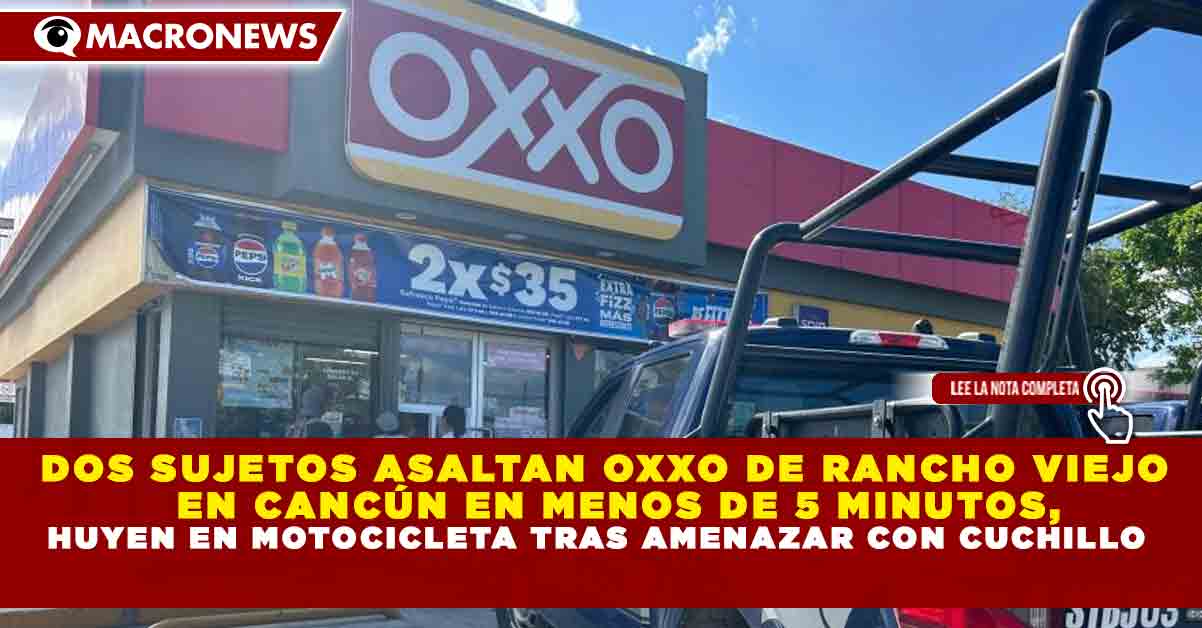 Redacción Macronews.- Un asalto a una tienda de conveniencia de la cadena Oxxo se registró la tarde de este día en la región 235 de Cancún, donde dos sujetos lograron sustraer dinero en efectivo y mercancía sin que se reportaran personas lesionadas.