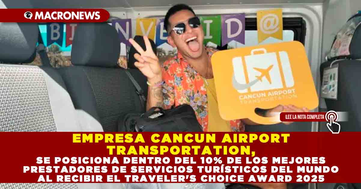 Redacción Macronews.- La empresa Cancun Airport Transportation, especializada en traslados privados en Cancún y la Riviera Maya, fue galardonada con el TripAdvisor Travelers’ Choice Award 2025, reconocimiento que la ubica dentro del 10 % de los mejores prestadores de servicios turísticos a nivel mundial. Este distintivo se otorga con base en las opiniones y experiencias reales de los viajeros, destacando la calidad, puntualidad y confianza que caracterizan a la compañía.