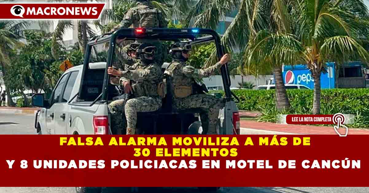 Redacción Macronews.- Una falsa alarma por presunta presencia de hombres armados provocó este miércoles un amplio operativo de seguridad en un motel ubicado en la ciudad de Cancún, lo que generó la movilización de más de 30 elementos policiacos y al menos ocho unidades de distintas corporaciones, sin que se registraran personas detenidas ni hechos delictivos.