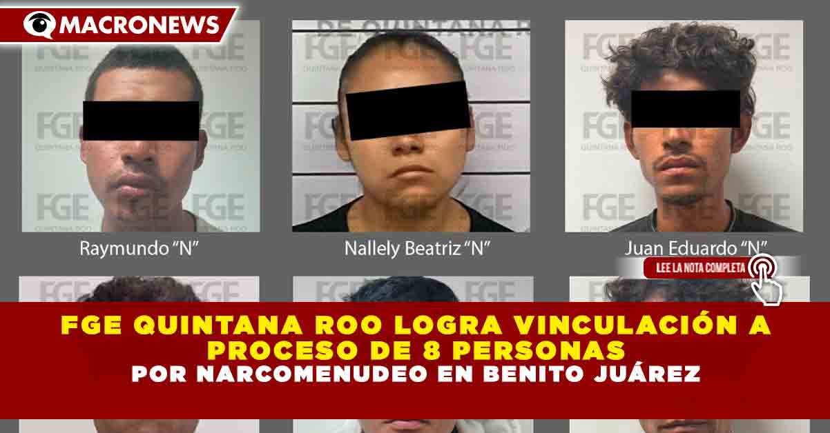 Redacción Macronews.- La Fiscalía General del Estado de Quintana Roo (FGE), a través de la Fiscalía Especializada en Combate al Delito de Narcomenudeo, obtuvo la vinculación a proceso de ocho personas en el municipio de Benito Juárez, tras aportar pruebas suficientes en audiencias separadas. Los imputados enfrentan cargos por delitos contra la salud en su modalidad de narcomenudeo, principalmente relacionados con la posesión y suministro de marihuana y metanfetaminas.