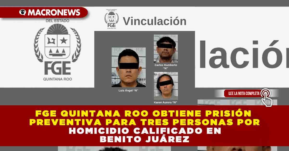 Redacción Macronews.- La Fiscalía General del Estado de Quintana Roo logró la vinculación a proceso y la imposición de prisión preventiva para Luis Ángel “N”, Carlos Humberto “N” y Karen Aurora “N”, por su presunta participación en el delito de homicidio calificado, derivado de hechos ocurridos el pasado 13 de octubre en la Supermanzana 252 del Fraccionamiento Vista Real, en el municipio de Benito Juárez.