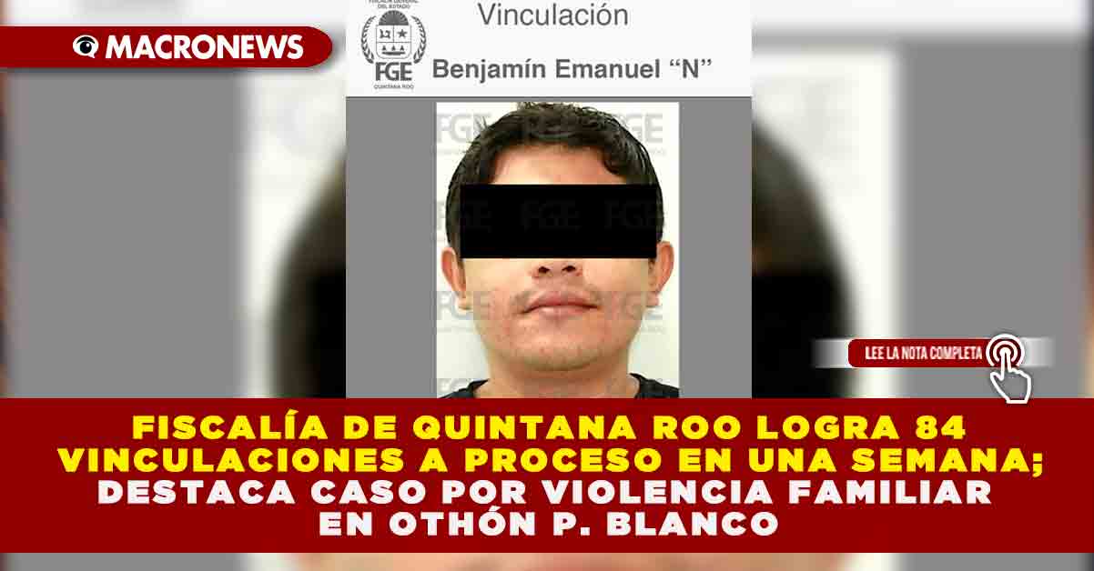 Redacción Macronews.- La Fiscalía General del Estado de Quintana Roo informó que, durante la semana del 20 al 26 de octubre de 2025, se obtuvieron 84 vinculaciones a proceso y 21 sentencias condenatorias por diversos delitos, entre ellos violencia familiar, homicidio calificado, extorsión y narcomenudeo. Uno de los casos más relevantes fue la vinculación a proceso de Benjamín Emmanuel “N”, por hechos posiblemente constitutivos de violencia familiar y lesiones en agravio de una mujer en el municipio de Othón P. Blanco.