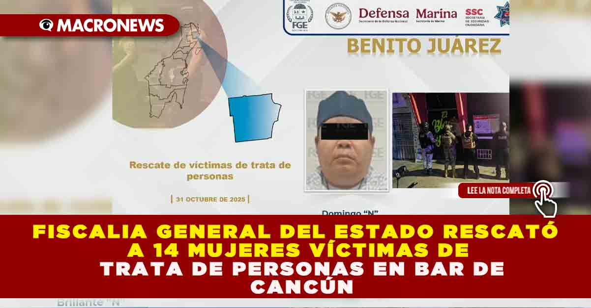 Elementos de la Policía de Investigación de la Fiscalía General del Estado (FGE), en coordinación con la Secretaría de Marina, Guardia Nacional, Secretaría de Seguridad Ciudadana y la Policía Municipal de Cancún, realizaron un cateo el pasado 31 de octubre en un bar ubicado en la Supermanzana 93, donde fueron rescatadas 14 mujeres mexicanas víctimas del delito de trata de personas, en su modalidad de explotación laboral y sexual.