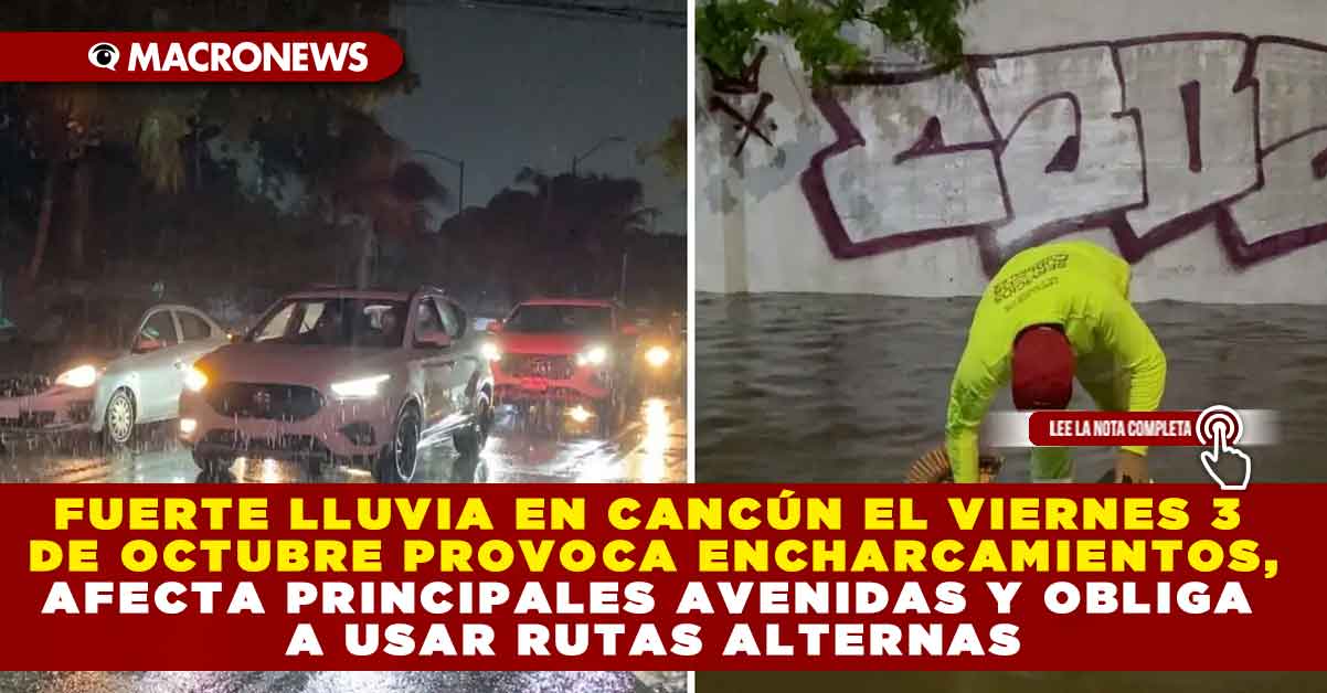 FUERTE LLUVIA EN CANCÚN EL VIERNES 3 DE OCTUBRE PROVOCA ENCHARCAMIENTOS, AFECTA PRINCIPALES AVENIDAS Y OBLIGA A USAR RUTAS ALTERNAS