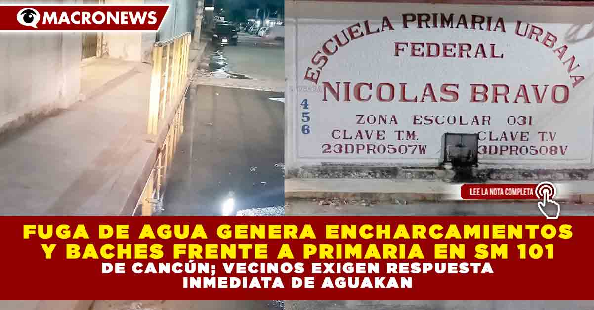 Redacción Macronews por Renán Moguel.- Vecinos de la calle 36, entre las avenidas 141 y 139, en la supermanzana 101 de Cancún, denunciaron una fuga de agua que lleva varios días sin ser atendida por la empresa concesionaria Aguakan, justo en la entrada de la escuela primaria federal urbana “Nicolás Bravo”.