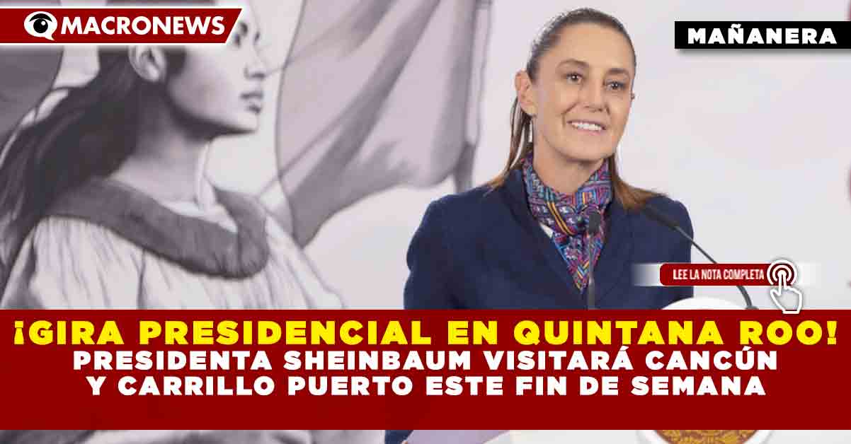 Redacción Macronews.- La presidenta Claudia Sheinbaum Pardo confirmó una intensa gira de trabajo de dos días por el estado de Quintana Roo. Con una agenda que abarca desde la alta diplomacia y el sector financiero hasta la supervisión de obras estratégicas y el impulso al turismo social, la mandataria recorrerá los municipios de Benito Juárez y Felipe Carrillo Puerto este jueves 19 y viernes 20 de marzo.