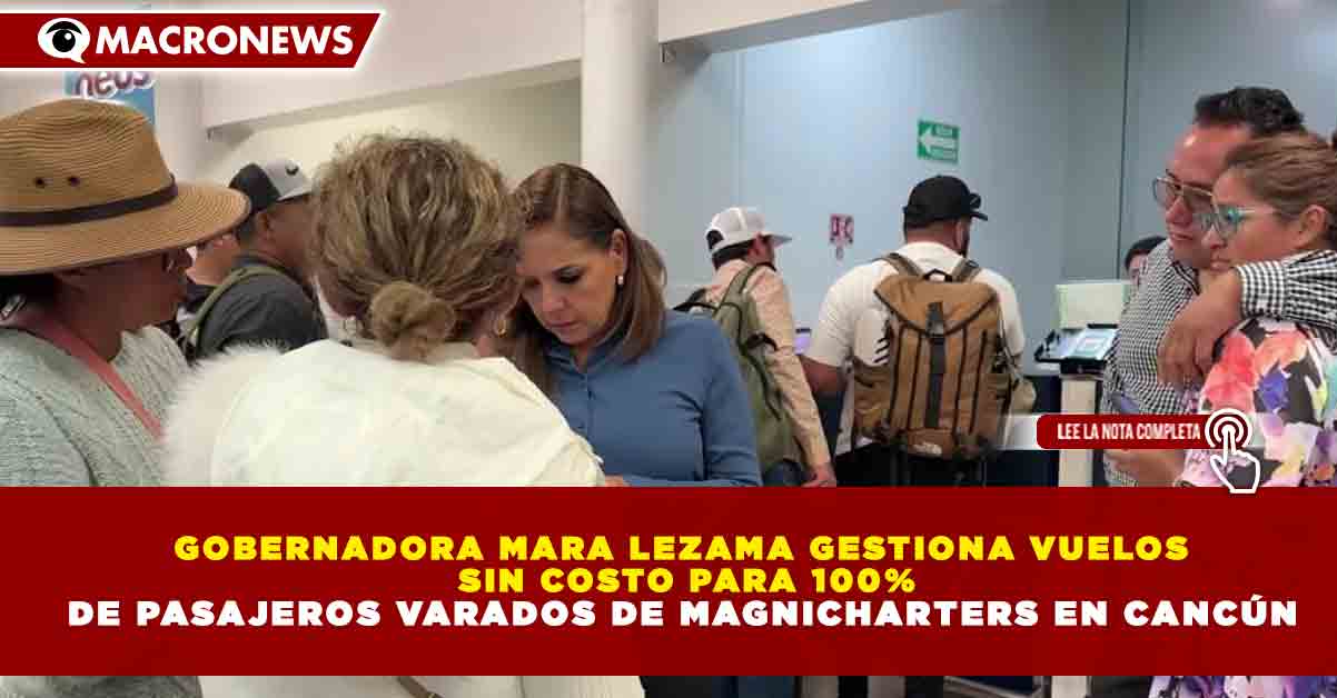 Redacción Macronews.- La gobernadora de Quintana Roo, Mara Lezama Espinosa, gestionó la implementación de vuelos sin costo para apoyar a los pasajeros afectados tras la suspensión de operaciones de la aerolínea Magnicharters en Cancún, medida con la que se busca atender al 100% de los usuarios varados y garantizar su traslado seguro a sus destinos.