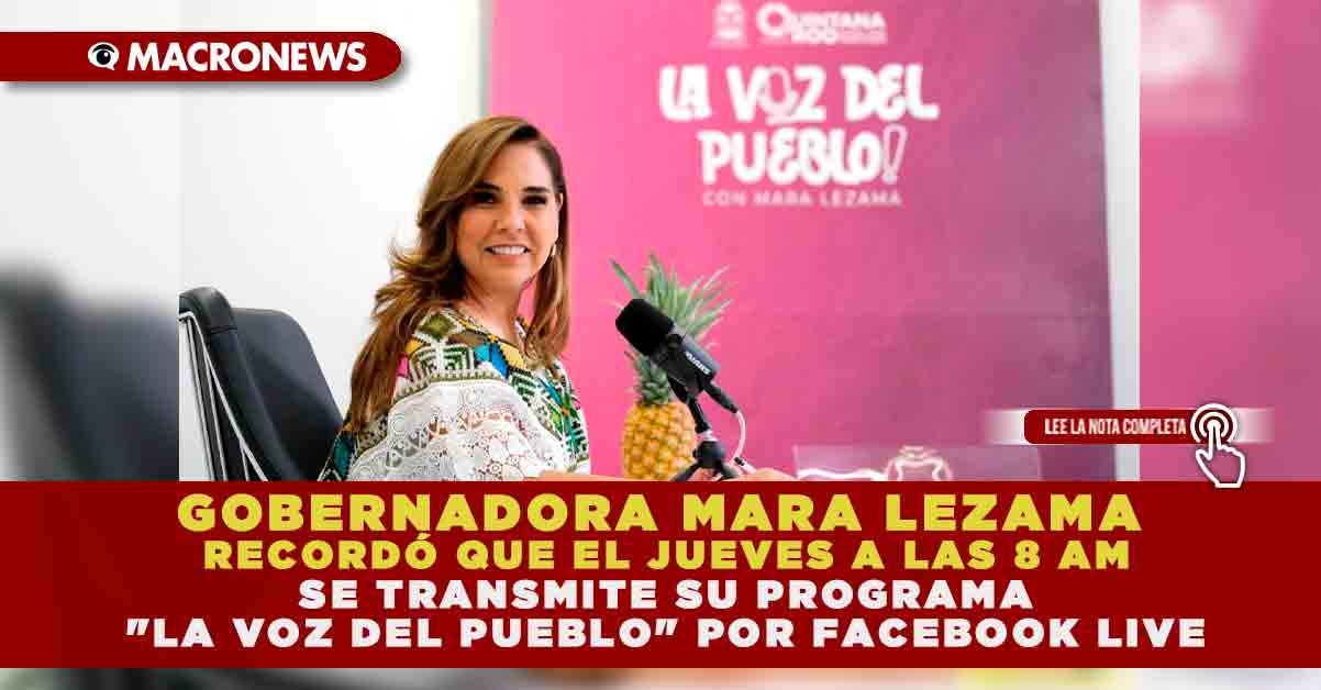 Redacción Macronews.- La gobernadora de Quintana Roo, Mara Lezama Espinosa, recordó a través de sus redes sociales que este jueves 11 de diciembre, en punto de las 8:00 am, se transmitirá en vivo el programa “La Voz del Pueblo” mediante Facebook Live, un espacio destinado a escuchar y atender de manera directa las inquietudes de la ciudadanía.