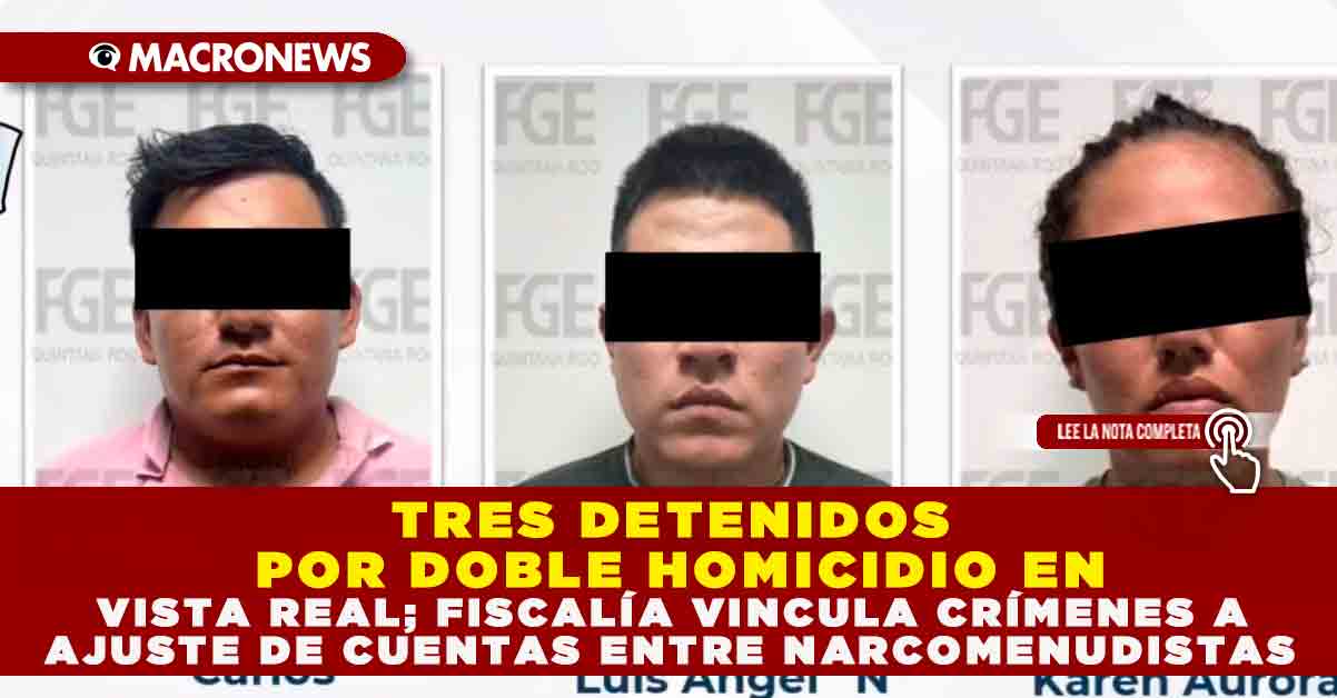 Redacción Macronews.- Tres personas fueron detenidas y vinculadas a proceso por su presunta participación en el asesinato de una pareja en el fraccionamiento Vista Real, supermanzana 252 de Cancún, ocurrido el pasado 13 de octubre. De acuerdo con la Fiscalía General del Estado (FGE), los implicados también estarían relacionados con otro homicidio cometido un día antes, lo que refuerza la hipótesis de un ajuste de cuentas entre grupos dedicados al narcomenudeo.