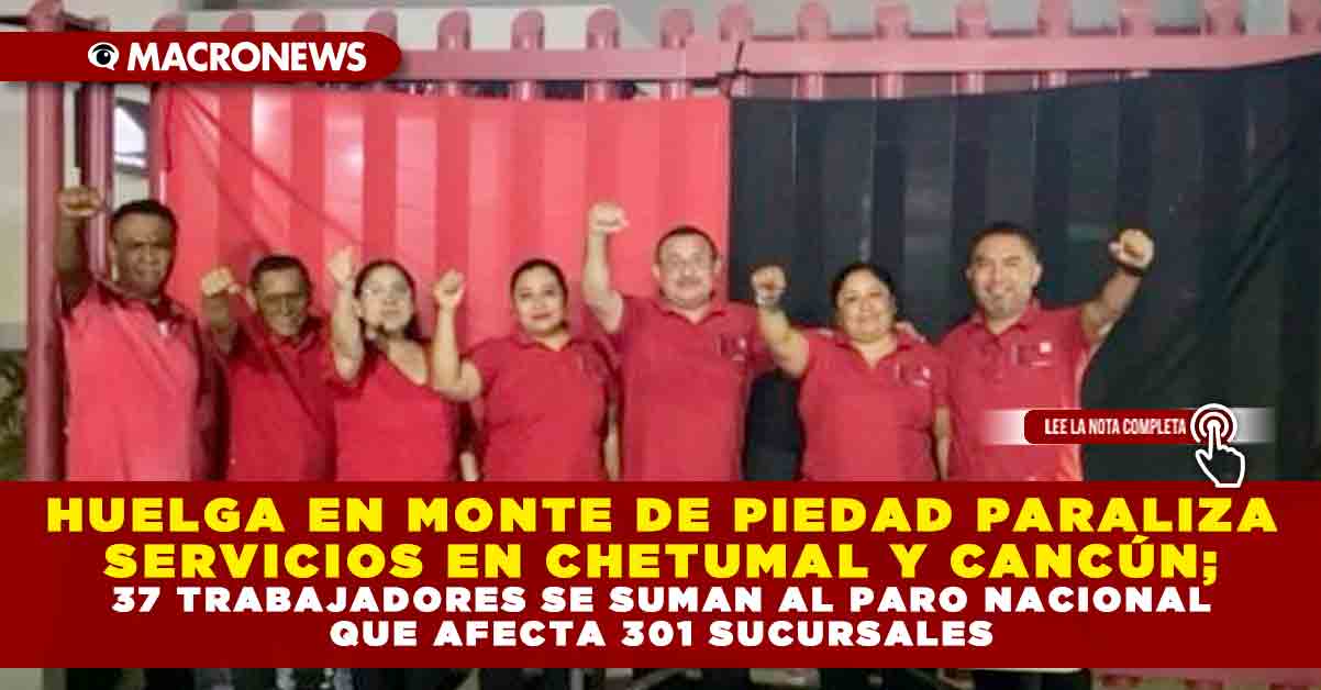 Redacción Macronews.- Desde la medianoche del martes 1 de octubre, trabajadores del Sindicato del Nacional Monte de Piedad (SNMP) en Chetumal y Cancún se sumaron al paro nacional que involucra a más de 2,000 empleados en 301 sucursales del país, en protesta por el incumplimiento del Contrato Colectivo de Trabajo (CCT) por parte de la Gerencia Nacional. En Quintana Roo, 37 trabajadores de tres sucursales colocaron las banderas rojinegras, suspendiendo de manera indefinida los servicios de empeño y préstamo.