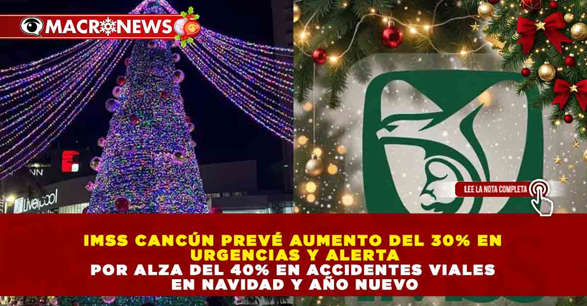 Redacción Macronews.- Durante las festividades de Navidad y Año Nuevo, el Instituto Mexicano del Seguro Social (IMSS) en Cancún prevé un incremento del 30% en los servicios de urgencias, por lo que garantizó atención médica las 24 horas en áreas críticas como urgencias, hospitalización y terapia intensiva, a fin de responder a la alta demanda de estos días.