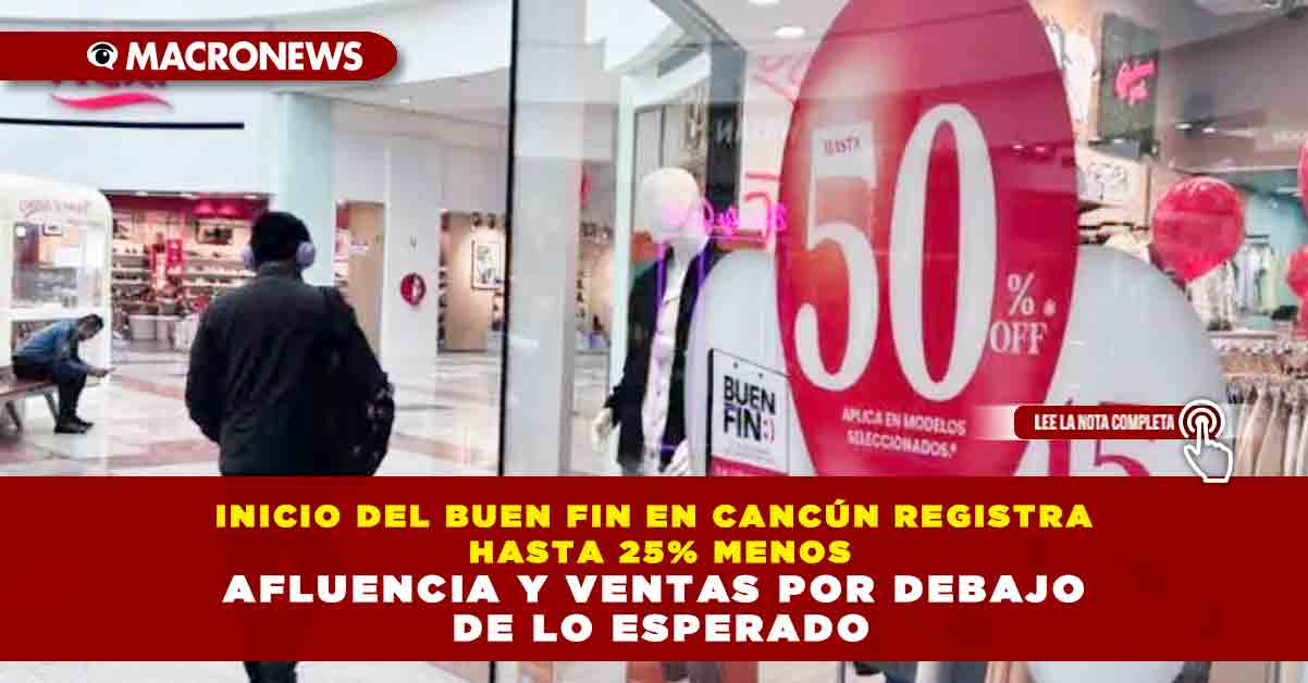 CANCÚN, QRoo, 13 de noviembre de 2025.- El inicio del Buen Fin en Cancún registró este jueves un comportamiento por debajo de lo esperado, con tiendas semivacías y consumidores que, en su mayoría, acudieron únicamente a comparar precios antes de decidir si comprarán durante el programa de descuentos que concluye el 17 de noviembre.