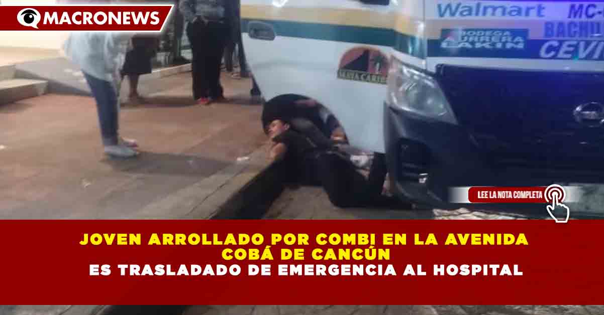 Un joven resultó gravemente herido tras ser arrollado por una combi sobre la Avenida Cobá en Cancún, motivo por el cual fue trasladado de emergencia a un hospital cercano, informaron autoridades locales y cuerpos de rescate.