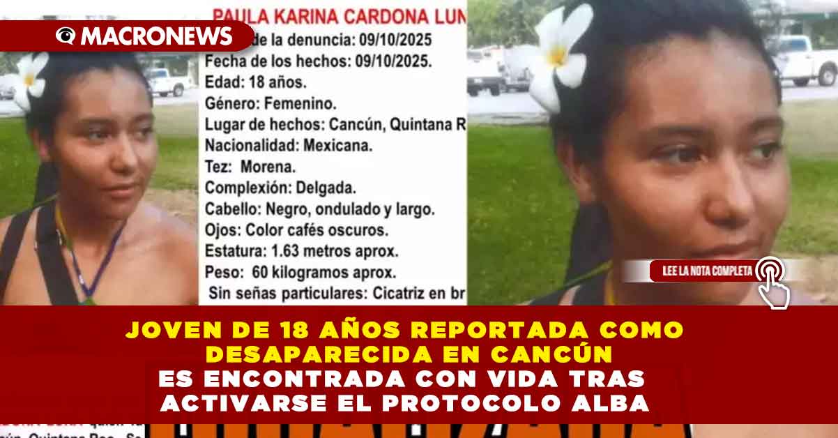 Autoridades de Quintana Roo desactivan el Protocolo Alba tras localizar a Paula Karina Cardona Luna, una joven de 18 años de edad que había sido reportada como desaparecida en Cancún el día 9 de octubre de 2025.