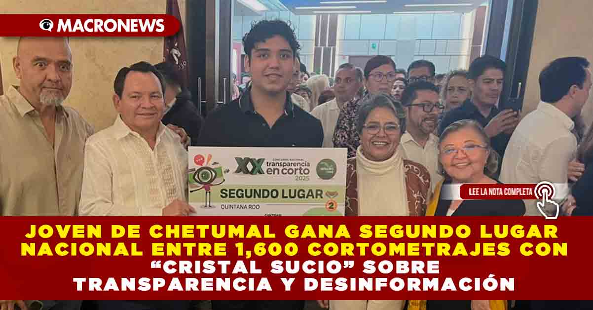 Redacción Macronews.- En el marco de la LXXV Reunión Nacional de la Comisión Permanente de Contralores Estados-Federación, celebrada en Mérida, Yucatán, el joven quintanarroense Francisco Bautista Gutiérrez fue reconocido con el segundo lugar nacional en el Concurso de Transparencia en Corto 2025, categoría de 15 a 18 años, por su cortometraje titulado “Cristal Sucio”. La obra destacó entre más de 1,600 videos provenientes de las 32 entidades federativas, siendo la primera vez que Quintana Roo figura entre los ganadores de esta competencia.