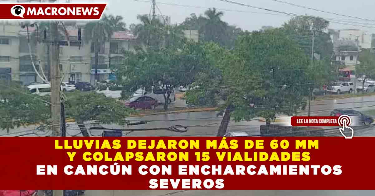 Redacción Macronews.- Intensas lluvias registradas durante las últimas horas en Cancún, con acumulados superiores a 60 milímetros, provocaron el colapso de al menos 15 vialidades principales, además de encharcamientos severos, tráfico lento y afectaciones a peatones y automovilistas en distintos puntos de la ciudad.