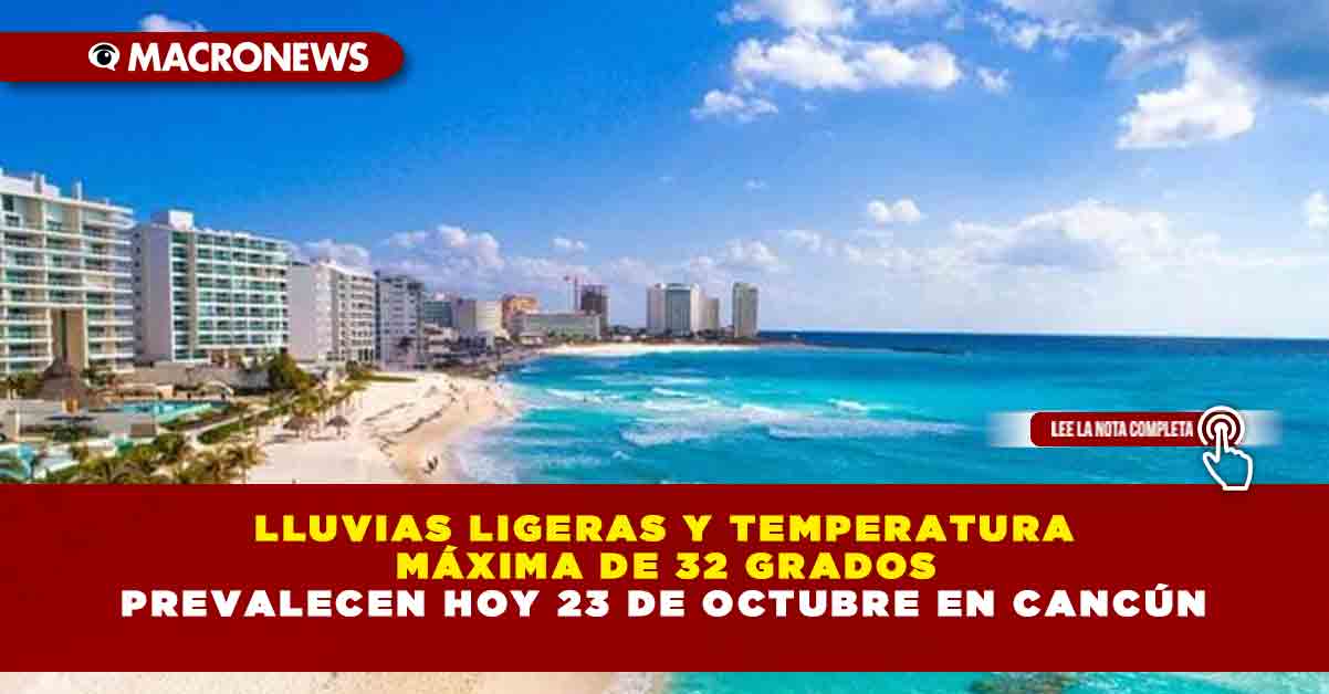 El clima en Cancún para este jueves 23 de octubre prevé que estará con lluvia ligera con 32 grados por la mañana y la temperatura máxima llegará a los 32 grados.