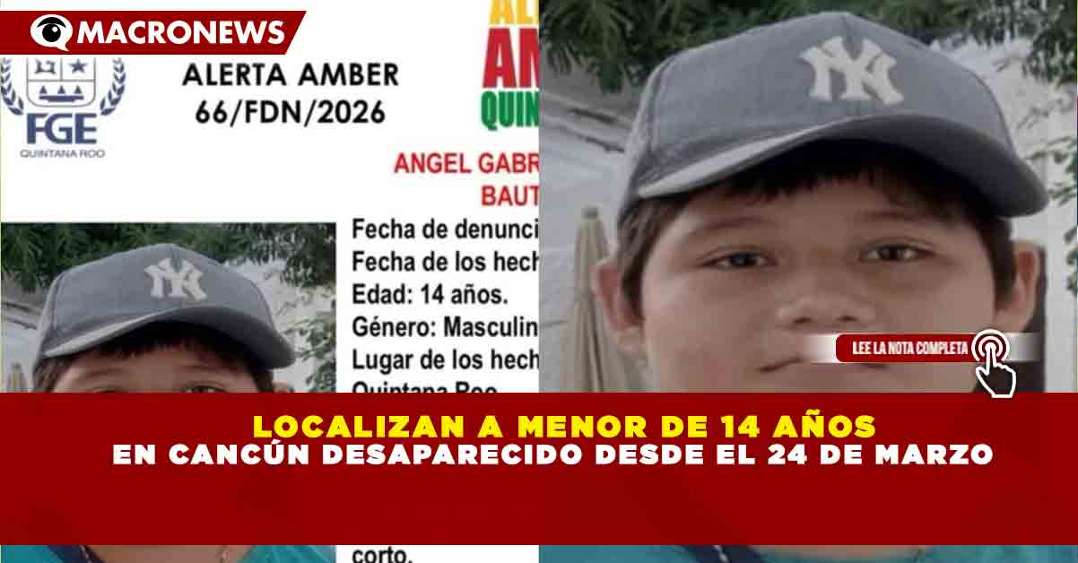 Redacción Macronews.- La Fiscalía General del Estado de Quintana Roo informó la localización de Ángel Gabriel Bruner Bautista, menor de 14 años que había sido reportado como desaparecido en Cancún, tras la activación de la Alerta Amber con folio 66/FDN/2026.