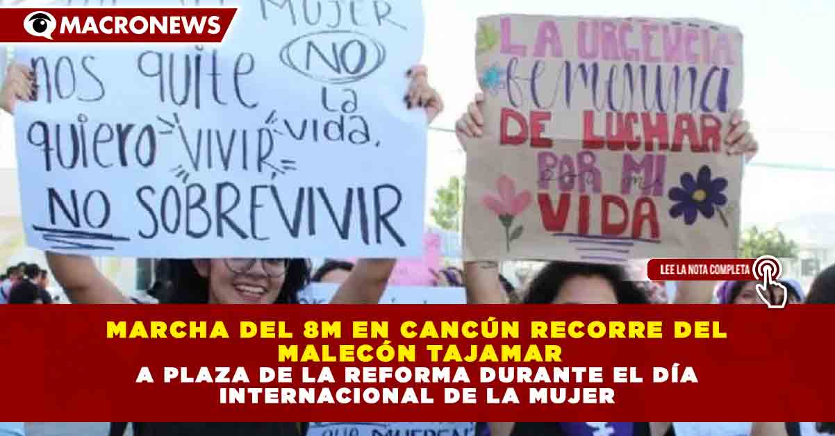 Redacción Macronews.- En el marco del Día Internacional de la Mujer, cientos de mujeres participaron este 8 de marzo en la marcha conmemorativa realizada en Cancún, donde el contingente recorrió tres puntos emblemáticos de la ciudad, iniciando en Malecón Tajamar y avanzando hacia el monumento conocido como El Ceviche, para finalmente arribar a la Plaza de la Reforma.