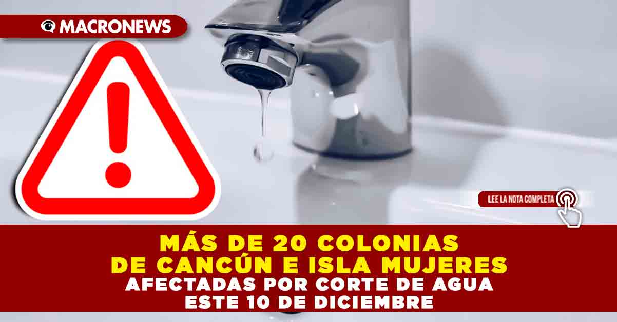 Redacción Macronews.- Este miércoles 10 de diciembre de 2025, más de 20 colonias de Cancún y diversas zonas de Isla Mujeres enfrentan un corte de agua potable debido a trabajos en la subestación de electricidad Nizuc, informó la empresa concesionaria Aguakan. La suspensión del servicio se extenderá durante toda la jornada, sin que se haya establecido un horario específico para la conclusión de las labores.