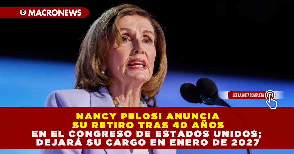 Redacción Macronews.- La representante demócrata por San Francisco, Nancy Pelosi, anunció este jueves que no buscará la reelección al Congreso de Estados Unidos, marcando el cierre de una carrera política de casi cuatro décadas en la Cámara de Representantes. Pelosi, quien hizo historia al convertirse en la primera mujer en presidir la Cámara Baja, dejará su cargo en enero de 2027, tras haber sido una figura clave en la política nacional y una voz influyente en momentos de alta polarización.