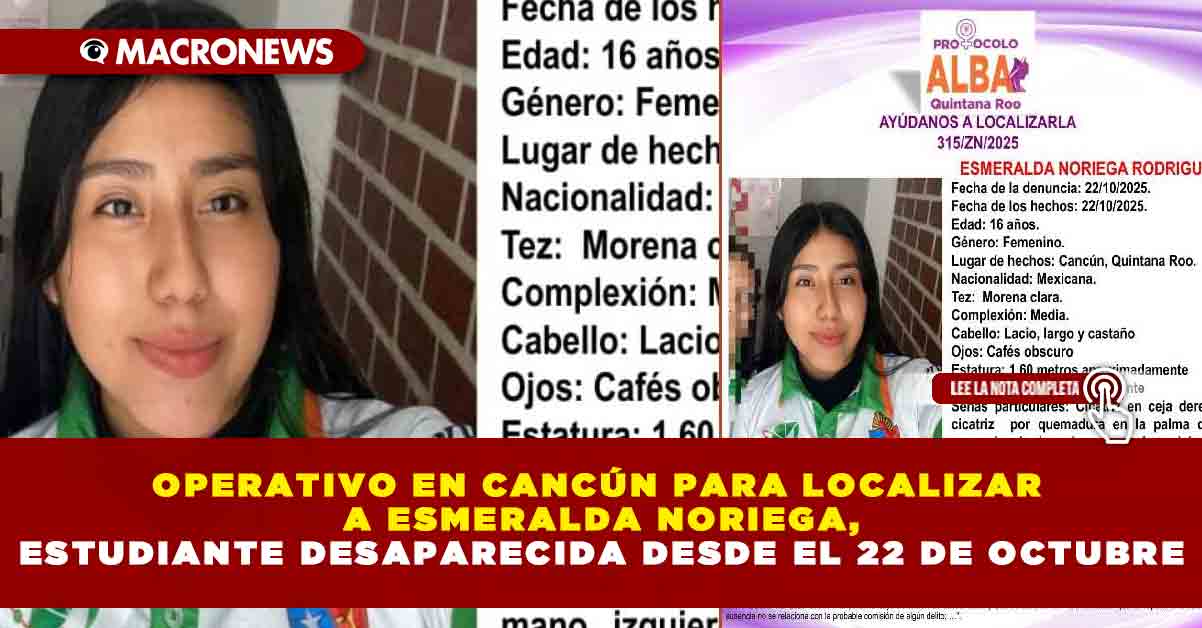 Esmeralda Noriega Rodríguez , estudiante del Cecyte en Cancún , quien fue vista por última vez el 22 de octubre de 2025 en el municipio de Benito Juárez.