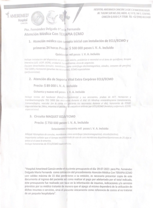 Incluye instalación del dispositivo en paciente, equipos desechables (circuito, membrana, cono centrífugo electromagnético, cánulas, sensores de presión), TEG 5000 y Hemocron (incluyendo las pruebas necesarias), y especialistas ECMO (perfusionistas). - — Atención de soporte vital extracorpóreo ECLS/ECMO: $89,000 por día, se estima un mínimo de 7 días