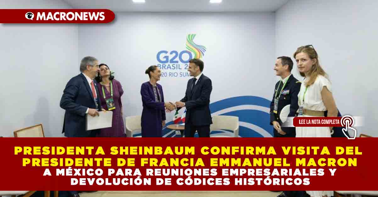 La presidenta Claudia Sheinbaum confirmó que su homólogo de Francia, Emmanuel Macron, visitará México tanto por reuniones empresariales como para la devolución de patrimonio cultural de nuestro país.