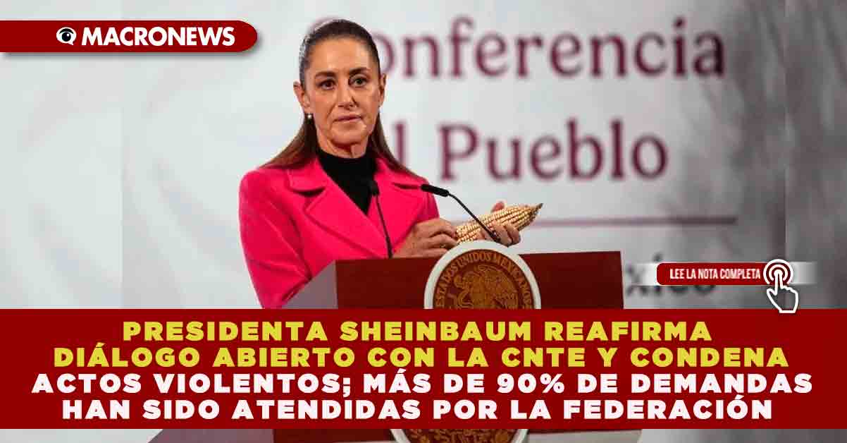PRESIDENTA SHEINBAUM REAFIRMA DIÁLOGO ABIERTO CON LA CNTE Y CONDENA ACTOS VIOLENTOS; MÁS DE 90% DE DEMANDAS HAN SIDO ATENDIDAS POR LA FEDERACIÓN