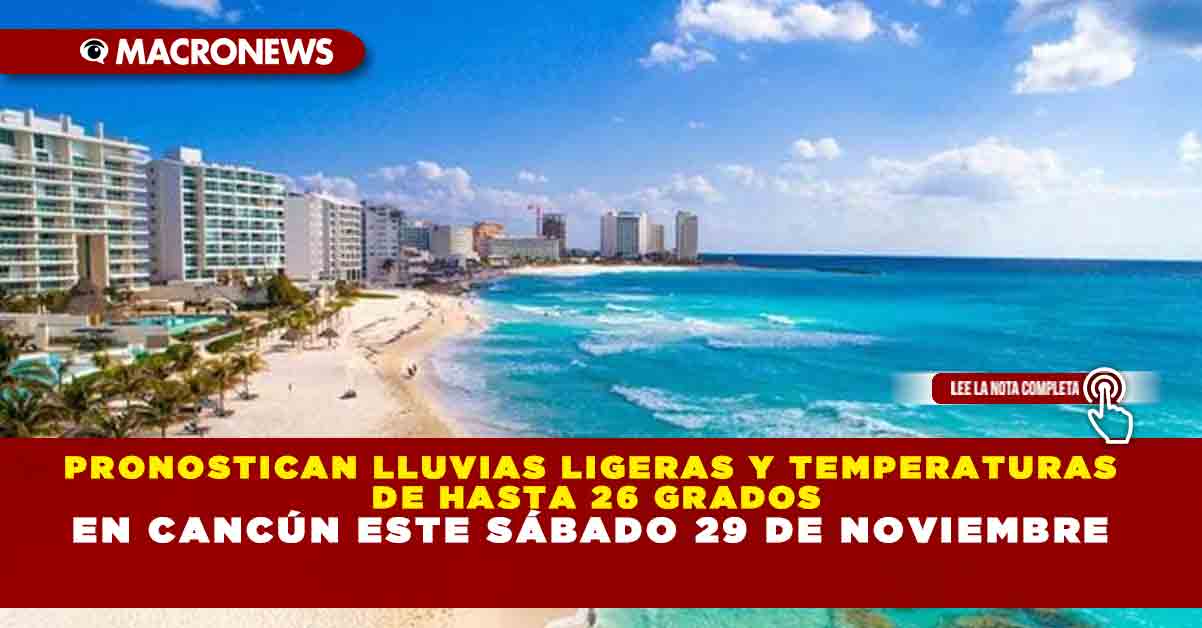 El clima en Cancún para este sábado 29 de noviembre anticipa que estará con lluvia ligera con 25 grados por la mañana y la temperatura máxima llegará a los 26 grados.