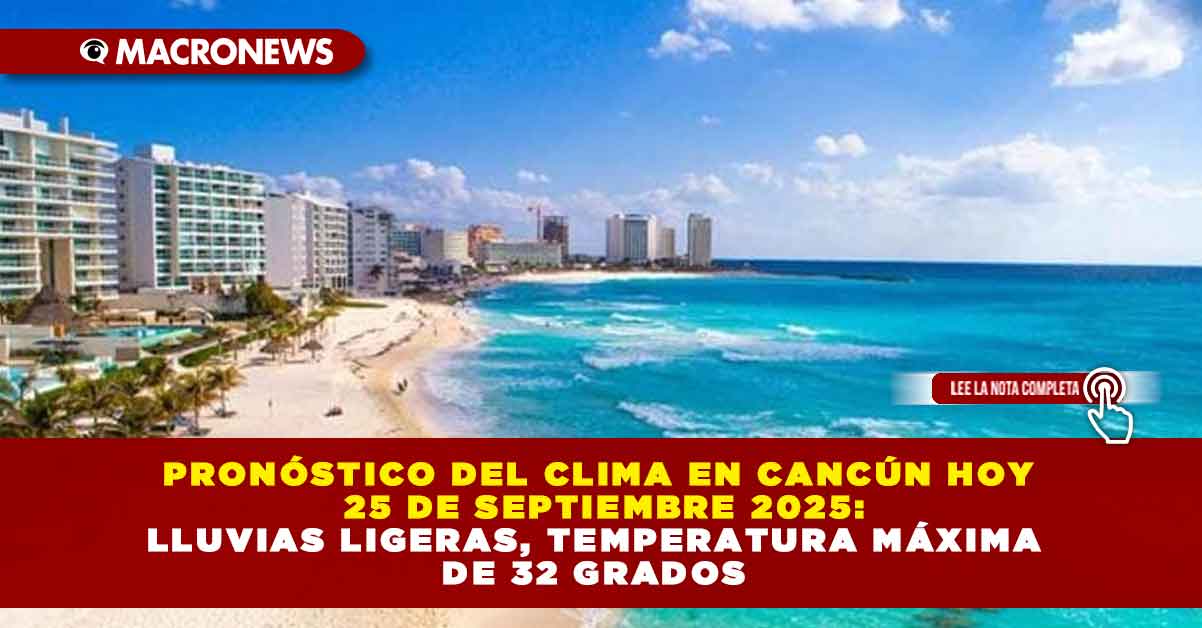 El clima en Cancún para este jueves 25 de septiembre anticipa que estará con lluvia ligera con 32 grados por la mañana y la temperatura máxima llegará a los 32 grados.