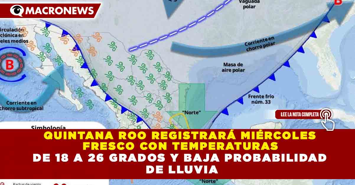 Redacción Macronews.- Quintana Roo tendrá un miércoles con ambiente fresco a templado, temperaturas mínimas de hasta 18 grados centígrados y máximas que oscilarán entre los 25 y 26 grados, además de bajas probabilidades de lluvia, de acuerdo con los pronósticos meteorológicos para la entidad.